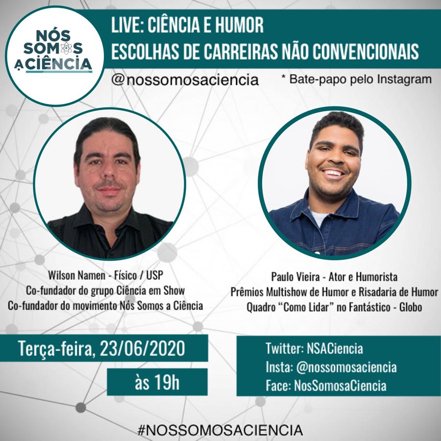 Mais um evento do “Nós Somos a Ciência” acontece nesta terça, dia 23 de junho. Ciência e humor, escolhas de carreiras não convencionais, será o tema da live, com a participação do ator e humorista, Paulo Vieira, do quadro “Como lidar”, do Fantástico da Rede Globo. A conversa com o físico, Wil Namen, começa às 19h. Acompanhem pelo Instagram:@nossomosaciencia