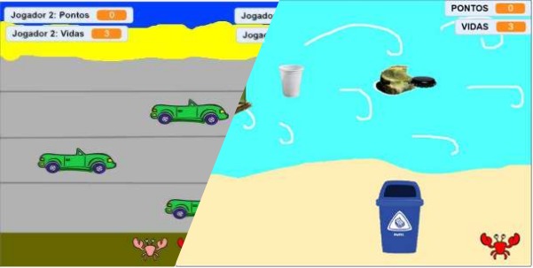 Os temas dos jogos eram bem próximos da realidade dos alunos, como a volta de um caranguejo ao mar, reciclagem de lixo e uma invasão de asteroides na terra. O jogo do caranguejo consistia em controlar um caranguejo para que ele chegasse até o mar, superando os obstáculos decorrentes da urbanização presente no local; o jogo da reciclagem, que consiste em clicar nos objetos a serem descartados, de modo que caiam na lixeira correta, possuindo um sistema de pontuação, caso o jogador acerte ou não a lixeira; e o jogo dos asteroides, onde tudo se passa num ambiente espacial, tendo como objetivo proteger a terra de asteroides. Cada um desses jogos foi construído utilizando o Scratch e permitiu introduzir conceitos aos alunos como plano cartesiano, noções de tempo, conceito de variáveis, entre outros. A descrição de cada jogo é do próprio bolsista.