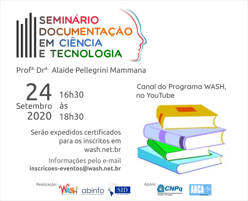 Foram prorrogadas até a meia-noite desta quarta, dia 23 de setembro, as inscrições para o Seminário “Documentação em Ciência e Tecnologia”, que será ministrado pela Profa. Alaide Pellegrini Mammana, nesta quinta, dia 24 de setembro, a partir das 16h30, no canal do Programa WASH, no YouTube. Em razão da grande procura, a organização do evento definiu a medida para garantir mais uma oportunidade para quem ainda não fez sua inscrição.
