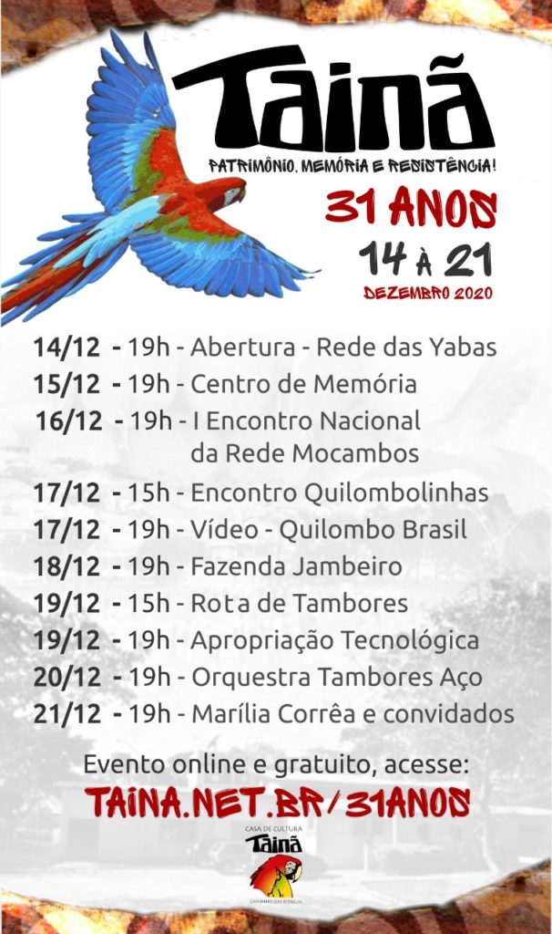 As comemorações destes 31 anos contam com uma série de atividades, que tiveram início no dia 14 de dezembro e prosseguem até o dia 21, próxima segunda-feira. Toda programação está sendo disponibilizada online, aberta e gratuita, no endereço taina.net.br/31anos. É cultura pra agradar a todos! Confira a íntegra da programação abaixo e acompanhe a entrevista com o coordenador, TC Silva.