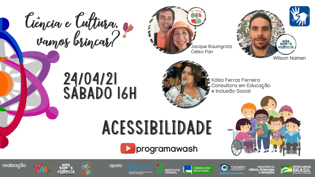 E este é o tema do nono episódio do Programa Ciência e Cultura, vamos brincar?: acessibilidade. Wil Namen, físico que representa o Nós Somos a Ciência, entrevista Kátia Ferraz Ferreira. Ela é consultora credenciada pelo Instituto de Gestão Organizacional e Tecnologia Aplicada – IGETEC em educação e inclusão social, com atuação principalmente nos seguintes temas: educação ambiental, sociedade civil e ong. Kátia também é consultora da VIA ACESSÍVEL Ltda e coordenadora da Rede Mineira de Tecnologia Assistiva da Secretaria de Desenvolvimento Econômico, do Estado de Minas Gerais.