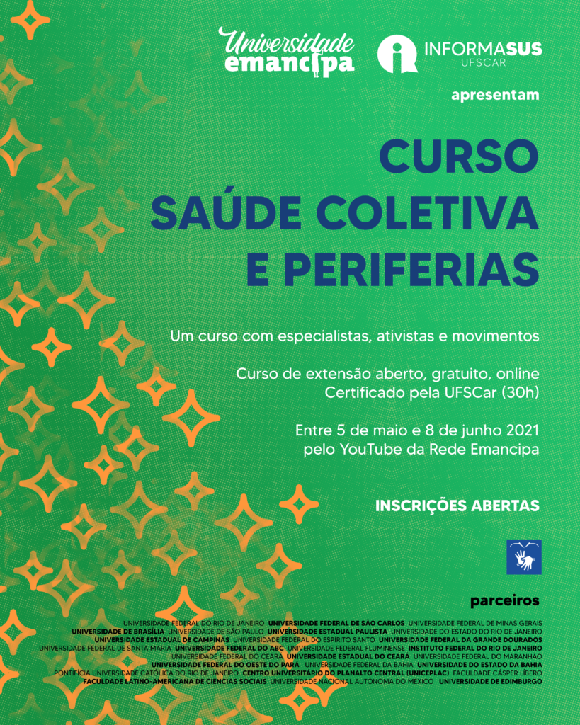 Estão abertas as inscrições para o curso “Saúde Coletiva e Periferias”, da Universidade Emancipa com a plataforma Informa-SUS. Aberto e online, o curso tem início em 4 de maio, às 19h00, pelo canal do YouTube da @redeemancipa, e se estende até o dia 8 de junho, com encontros semanais às terças-feiras. Ao final, será emitido certificado de participação de 30h pela UFSCAR.