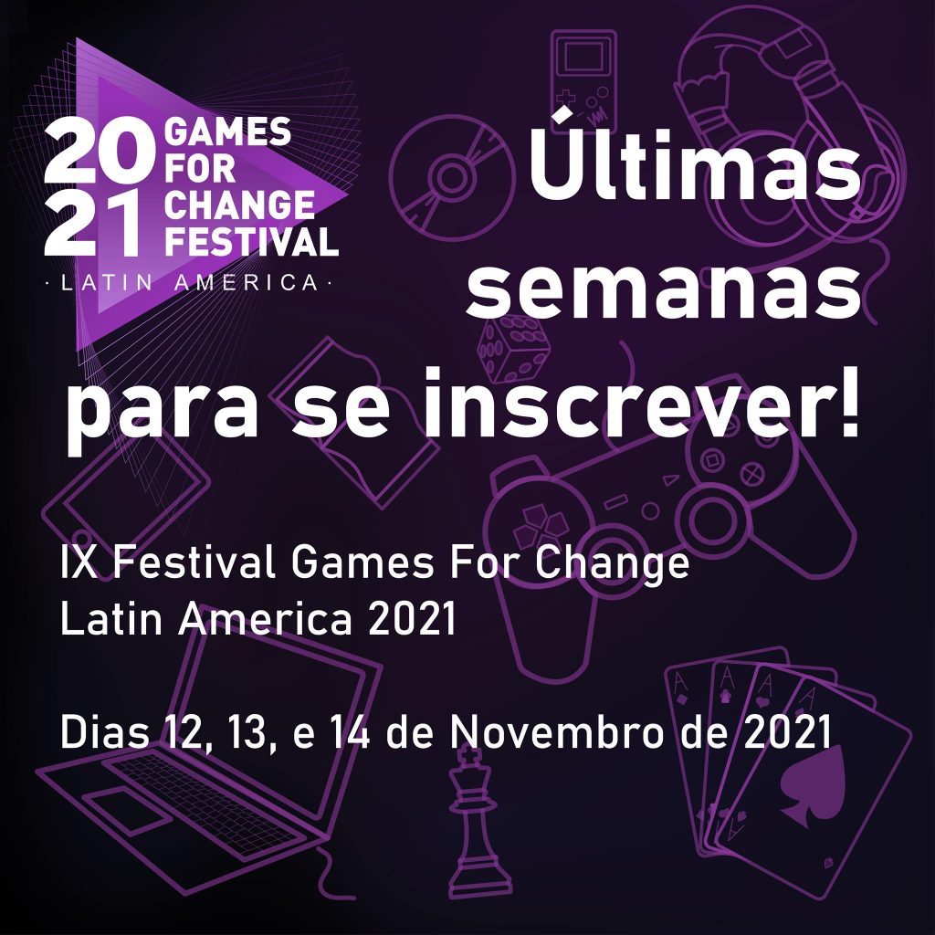 Que tal compartilhar seus jogos, analógicos ou digitais, com toda a América Latina? E que tal participar de palestras, produção de games, compartilhar seus projetos, jogos, mentorias e muitas outras oportunidades? Tudo isso acontecerá no IX Festival Games for Change América Latina, que está com inscrições abertas e gratuitas até o dia 7 de novembro. O evento online será nos dias 12, 13 e 14 de novembro e, além de uma vitrine para o mundo, pode ser uma porta de entrada para o universo dos games, internacionalmente.