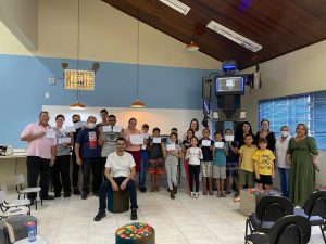 A prefeita de Prado Ferreira (PR), Maria Edna de Andrade, promoveu um evento, no último dia 15 de julho, para apresentar para a comunidade um robô de 3 metros de altura, resultado do trabalho de ciência e tecnologia realizado com os alunos do Programa Profissão 4.0, uma iniciativa da prefeitura, vinculado à Secretaria de Assistência Social, que tem, entre suas ações, uma parceria com o Projeto WASH. Além do lançamento, foi feita a entrega dos certificados de conclusão dos cursos de Robótica Básica; Robótica Avançada; Arduino; e Instrutor de Tecnologia.
