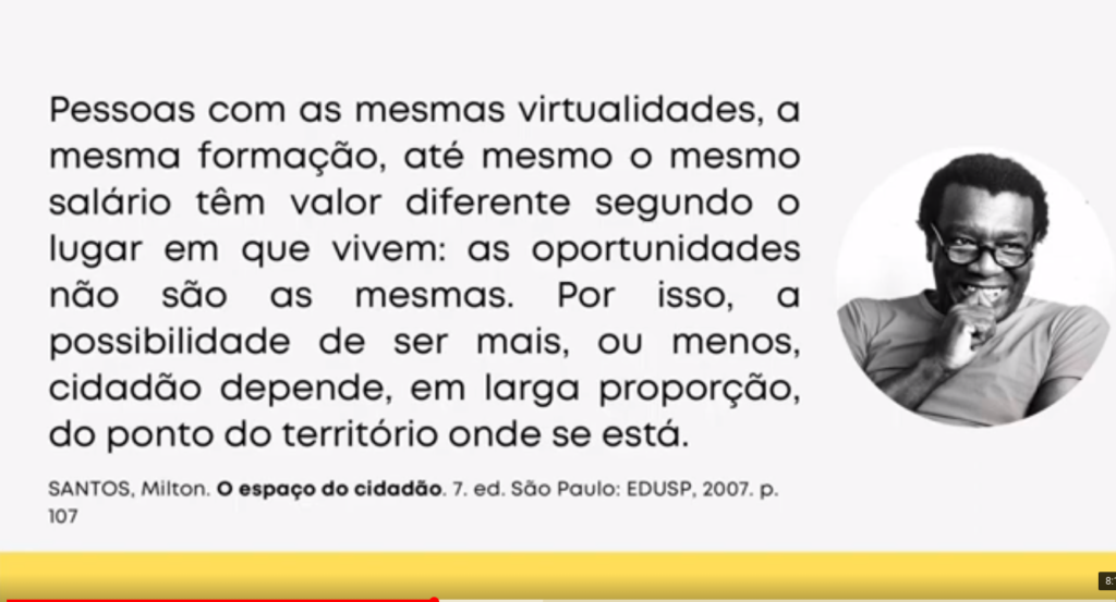Ele coloca questões como: “quem sou, onde estou e como eu posso acessar a cidade? que podem ajudar a compreender o direito à cidade e, ainda, o papel da escola para ajudar a questionar e romper com o peso da questão do território na definição dos direitos do cidadão.